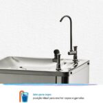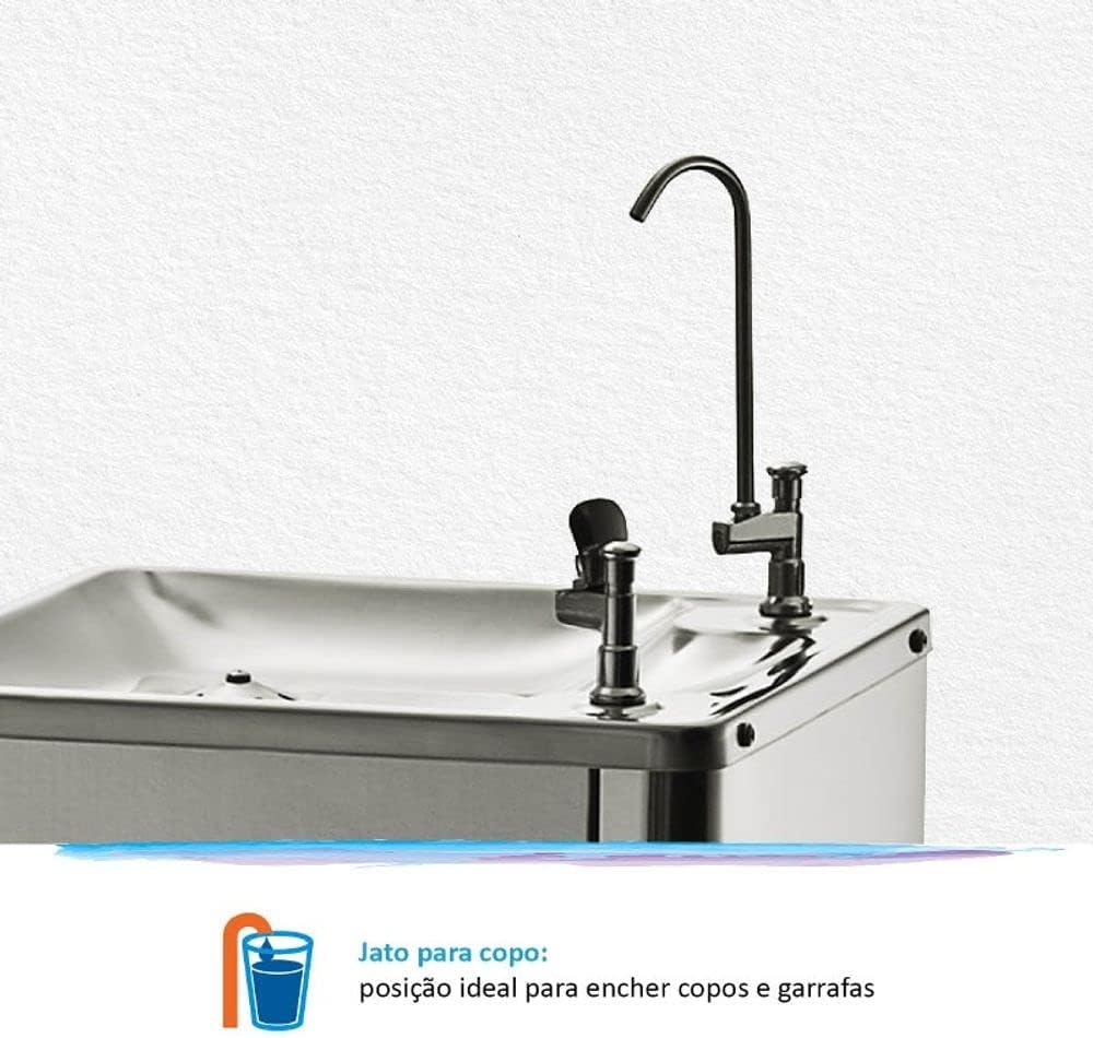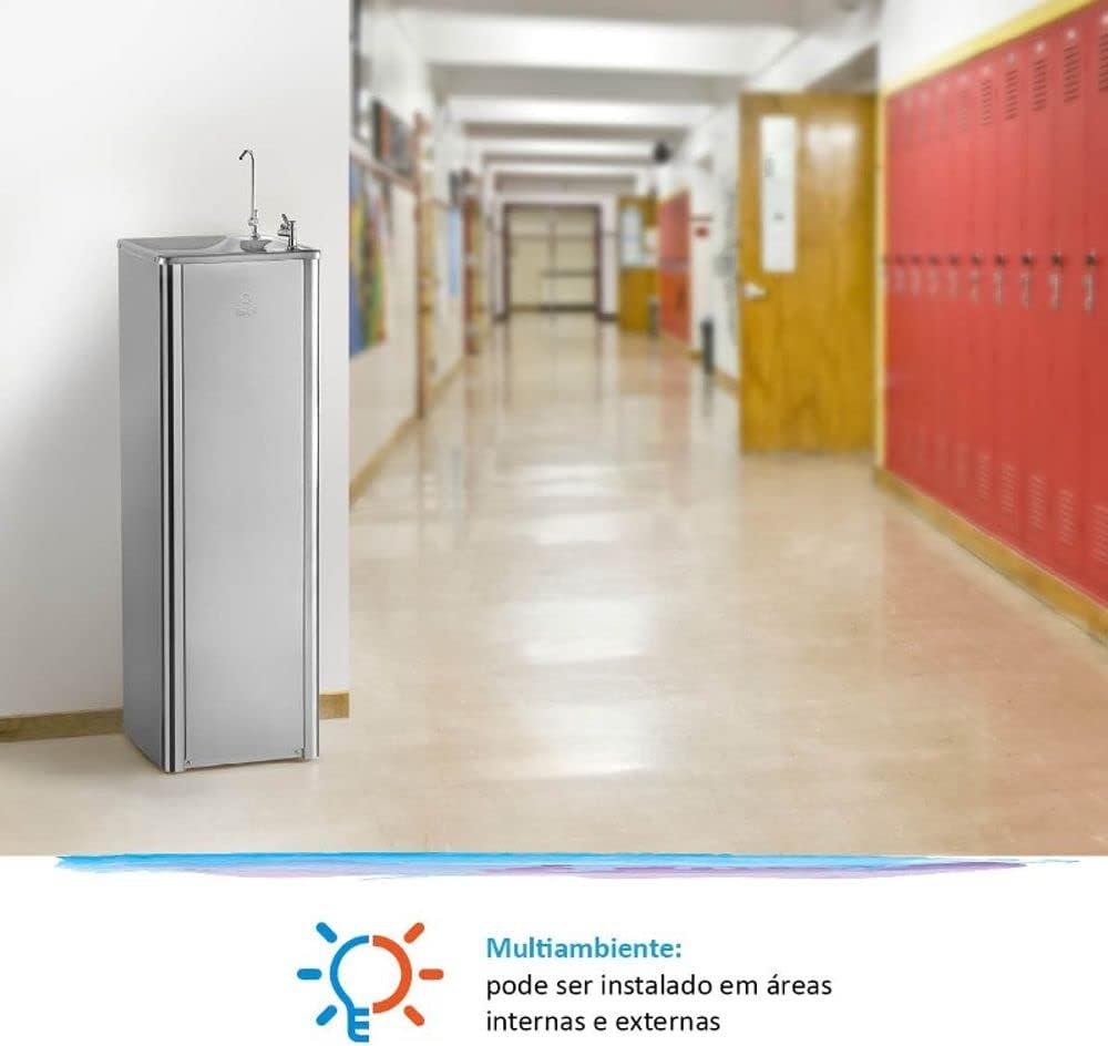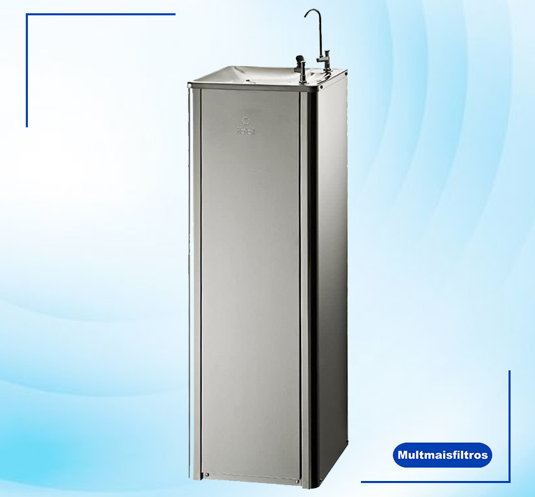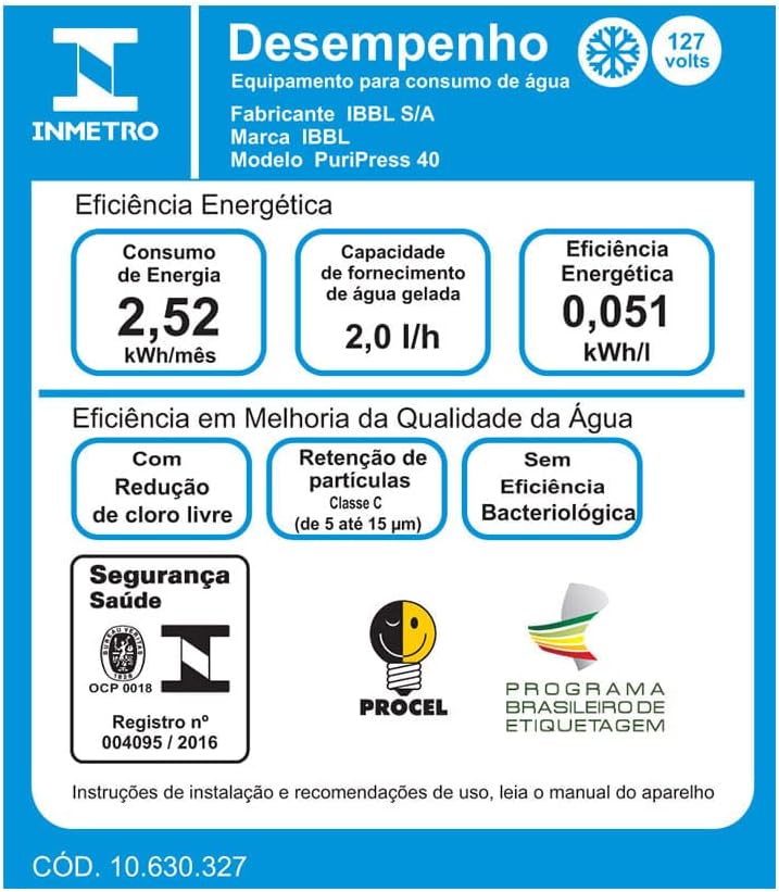 Purificador de Pressão IBBL Puripress 40 – 127 Volts Os Purificadores IBBL Puripress 40 e PuriPress 40C oferecem água pura e na temperatura ideal para locais ondehá grande circulação de pessoas. Eles possuem design coluna e podem ser instalados tanto em áreas internas quanto externas. Com baixo consumo de energia e muita eficiência, têm capacidade para refrigerar 2 litros de água por hora. Para garantir água pura para todos, contam com 3 etapas de purificação e máxima eficiência na redução de cloro. Com 2 torneiras, uma de jato para a boca e outra de jato para copo ou squeezes, oferecem duas opções para escolha na hora de se servir. Design coluna Jato para boca Jato para copo Regulagem do jato de água Easy Clean (desmontável para higienização) Serpentina externa (fácil higienização) Gabinete cor inox Tampo em aço inox polido Depósito de água em aço inox 304 Dreno para limpeza Pés antiderrapantes Controle automático de temperatura Refil Girou, Trocou: troque sem fechar o registro
