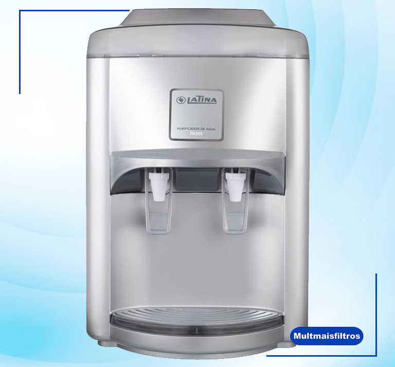 Purificador de Água Latina PA355 127V – Prata. O PA355 da Latina é um purificador de água com sistema de refrigeração por compressor que oferece alta capacidade para fornecimento de água gelada. Certificado pelo Inmetro, com eficiência comprovada em eliminação de impurezas e remoção de cloro, esse purificador pode ser utilizado tanto em ambiente doméstico quanto corporativo. O PA355 tem controle manual de temperatura que possibilita maior eficiência energética, duas torneiras e bandeja removível. O filtro de reposição do purificador de água PA355 é bacteriostático e impede a proliferação de bactérias e outros micro-organismos. Esse filtro é ecológico, seu carvão ativado é gerado a partir do endocarpo do coco de babaçu, além de ser muito fácil de trocar. Este purificador de água está disponível nas cores Branco e Fumê, Branco e Verde, Prata e Preto. Água gelada ou natural, leve, pura e com o melhor custo-benefício. Purificador de água PA355 Latina. Aprovado por milhões de Brasileiros! Confira a tensão antes da compra (127 v ou 220 v). O Filtro de reposição do Purificador PA355 deve ser substituído a cada 6 meses ou 3.000 litros e é muito simples de trocar, sem necessidade de ferramentas ou qualquer outro acessório. O Filtro de reposição realiza as seguintes funções: • Filtra sujeiras, resíduos das tubulações, ferrugem e outras impurezas,. • Inibe a proliferação de algas e bactérias, • Elimina o excesso de cloro, gostos e odores desagradáveis da água,. • Preserva o flúor e a saúde bucal. • Certificado Pelo Inmetro Especificações Técnicas Garantia 12 meses Tipo de refrigeração Compressor Utiliza gás ecológico Reservatório de água gelada 2 litros Tensão de alimentação (V) 127v Controle de temperatura – Água gelada – Termostato regulável de 12ºC a 5ºC Bandeja removível Modelo do Filtro de Reposição: Filtro P355 Troca do Filtro de Reposição: 6 meses ou 3.000 litros de água Dimensões do produto A x L x P (mm) 460 x 315 x 380 Peso: 11,5 kg Cor: Prata