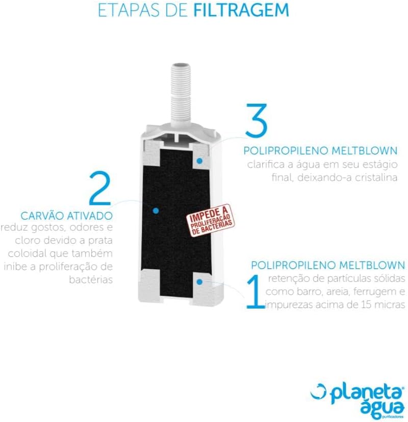 Elemento filtrante com o melhor custo/benefício do mercado, absorve cloro, retira sabores desagradáveis e reduz substncias químicas e orgnicas da água.